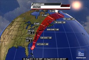 Meteorologists caution that Irene will impose severe conditions on the major metropolitan areas of the Mid-Atlantic and Northeast, including Norfolk, Washington, Baltimore, Philadelphia, New York City, Hartford and Boston. “This hurricane has the potential to produce flooding rains, high winds, downed trees (on houses, cars, power lines) and widespread power outages,” the site warns.